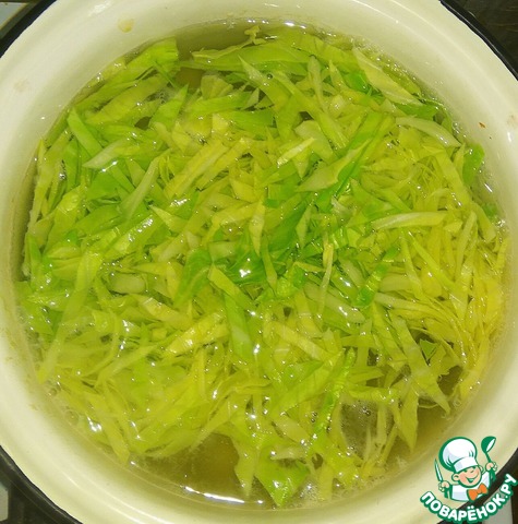 В кипящую воду опускаем очищенный и нарезанный картофель и нашинкованную капусту. Прикрыть крышкой, варить15 минут.