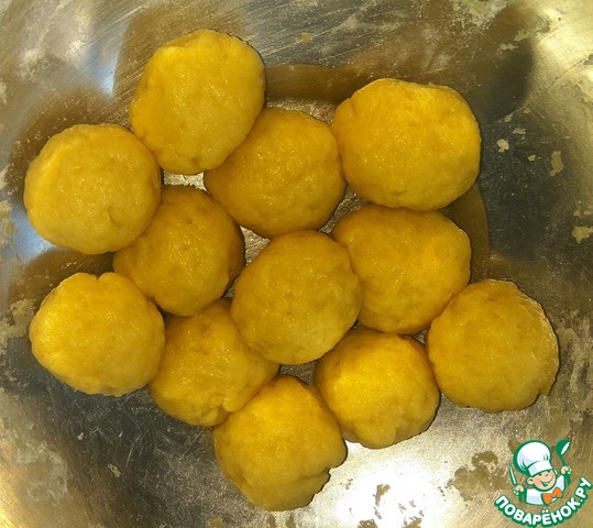 Разделить тесто на 12 частей. Скатать шарики. Накрыть пищевой плёнкой и убрать в холодильник на 1 час.