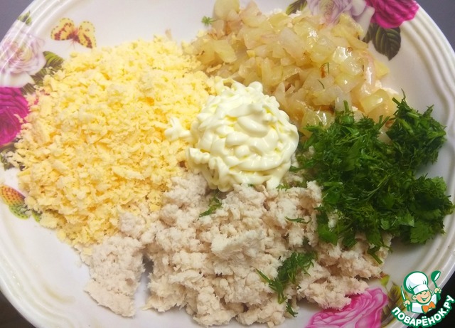 Для начинки куриное мясо отварить в подсоленной воде до готовности. Измельчить с помощью мясорубки или блендера.