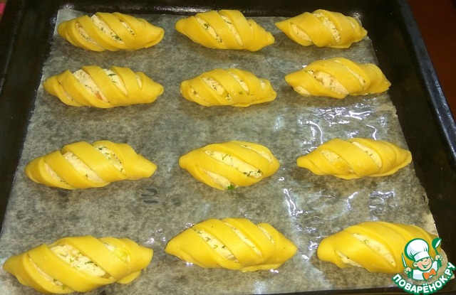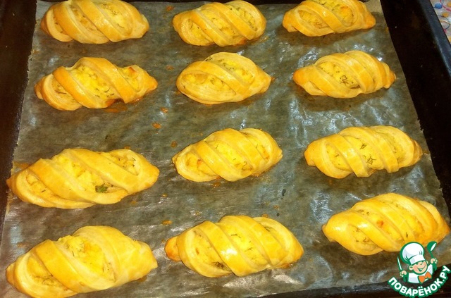 Очень вкусные хрустящие пирожки, с ароматной, нежной начинкой из курицы, сыра, зелени и лука. А еще у этих пирожков красивая формовка, похожая на ракушку. Их можно взять с собой на перекус, а можно подать к первым или вторым блюдам. Я подавала эти пирожки с борщом, очень вкусно!