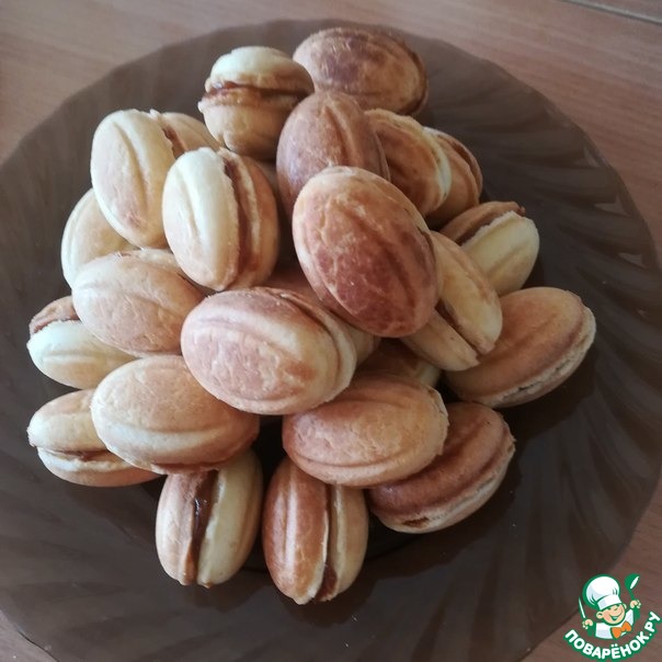 Тесто надо накатать шариками примерно 1,5-1,8 в диаметре (правда надо пробовать у каждого свои размер формы). Жарить орешки до румяного цвета периодически переворачивая. Получилось у меня примерно на 100 орешков (которые ушли за один день)