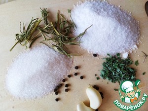 • Смешать соль, сахар, натертый чеснок, перец, тархун и душицу (орегано). Залить 1 литром воды и довести до кипения. Остудить.