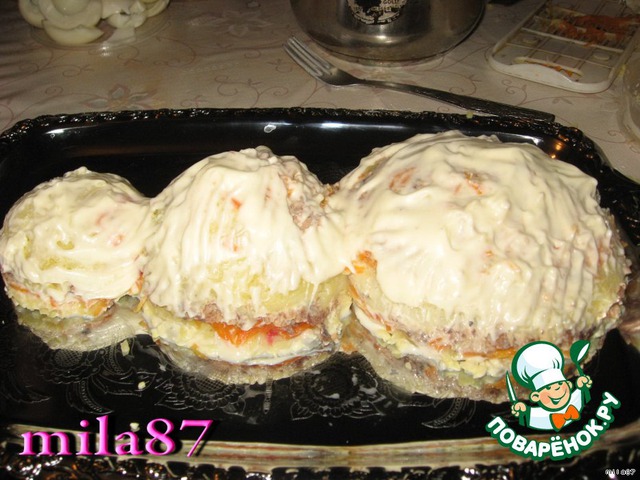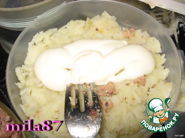 В первую миску натираем три картофелины, тщательно промазываем майонезом.