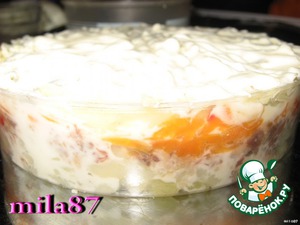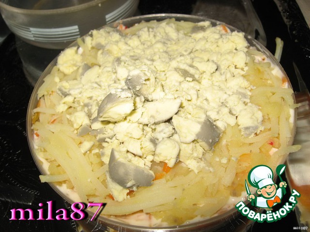 Затем слой картофеля и три желточка, тщательно промазываем майонезом и прижимаем.