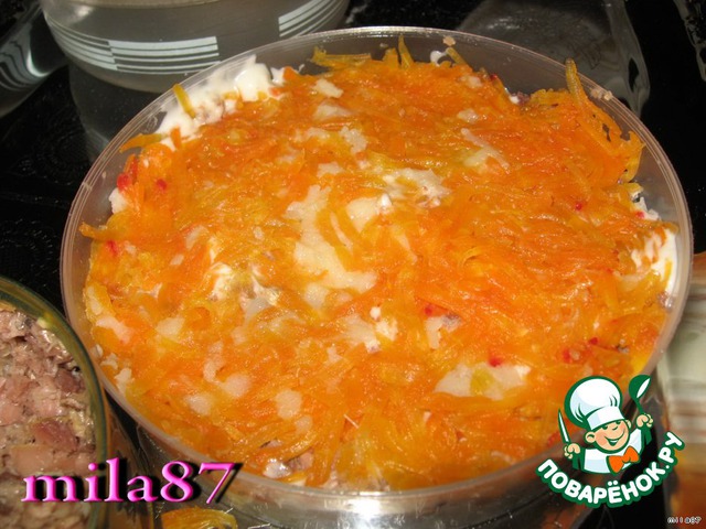Трем половинку от моркови ( сразу оставьте морковь для носика, чтобы не забыть), покрываем майонезом.