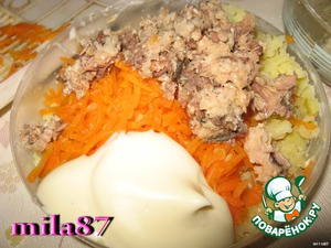 Оставшиеся продукты натираем на терке и смешиваем с майонезом.