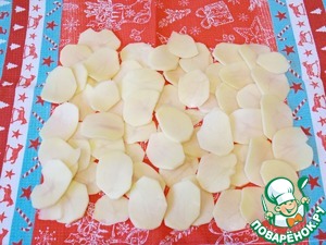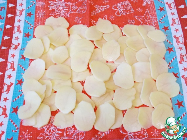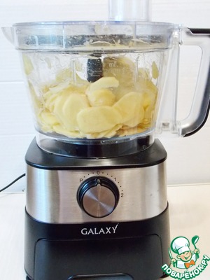 Теперь нужно нарезать картофель тонкими слайсами. Можно это сделать в ручную или на специальной терке. Я же воспользовалась кухонным комбайном "GALAXY".