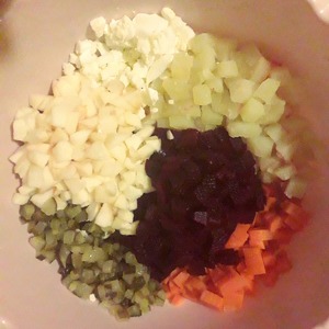 Отвариваем свеклу, морковь, картошку и яйца. Все ингредиенты нарезаем небольшими кубиками.