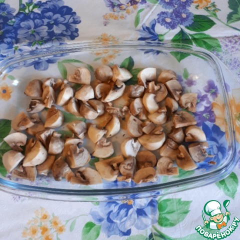 Приготовление салата начнем с запекания грибов шампиньонов. Грибы разрезать на части, полить кунжутным маслом и запекать в духовке 10-15 минут, не солить, если есть гриль, то запекать под грилем.
