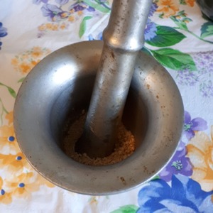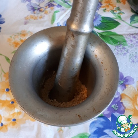 Кунжут обжарить на сухой сковороде, исполочь в ступке.
