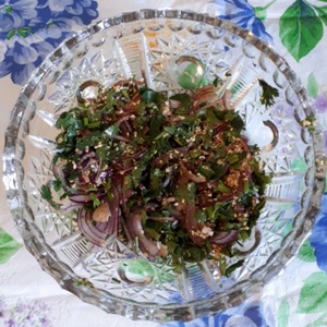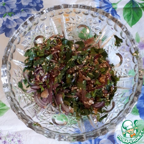Смешать в чаше кунжут, лук соломкой, кинзу и жидкую часть заправки. Получилась вот такая густая заправка.
