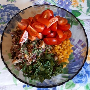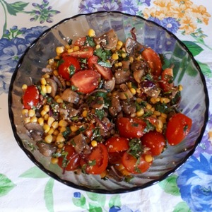 Теперь смешиваем все ингредиенты-грибы, кукурузу, черри и густую заправку, перемешиваем, пробуем на вкус, если надо, то досаливаем. Черри я разрезала на две части, если они мелкие, и на четыре части, если крупные. Кукурузу брала "Бюндюэль"большую банку.