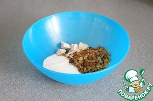 Сложить в чашку изюм, сахар и дрожжи. Изюм лучше всегда добавлять сразу. Иначе в готовое тесто его вмешать будет сложной задачей.