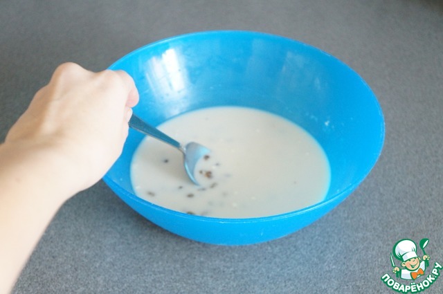 Влить в чашку, размешать хорошо, чтобы от дрожжей не осталось комков. -