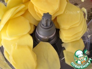 Картофель очистить, нарезать ломтиками на первой скорости (понадобилось менее 30 секунд, только и успевала картофель подкладывать). Выложить из чаши комбайна.