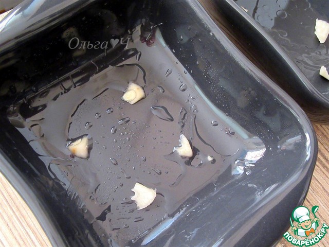 Формочки для запекания смазать маслом, добавить кусочки чеснока.