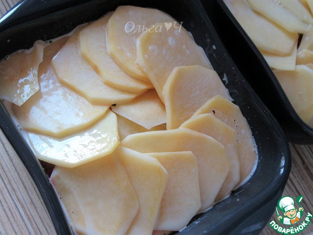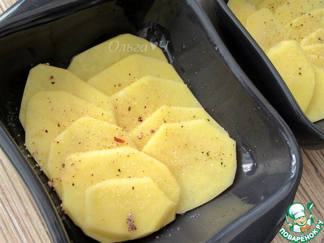 Слоями внахлест уложить картофель, присолить, поперчить.