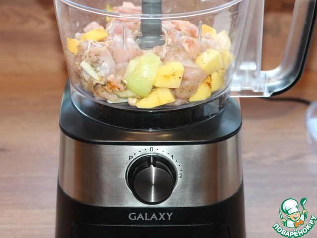 1. Приготовим фарш. Очищенный картофель 1 шт и репчатый лук 1 шт, нарезаем крупными дольками. Смешиваем мякоть курицы с картофелем, луком и прессованным чесноком 1 зуб.. Добавляем сухую приправу для курицы (1 ч. л.), солим и перчим.