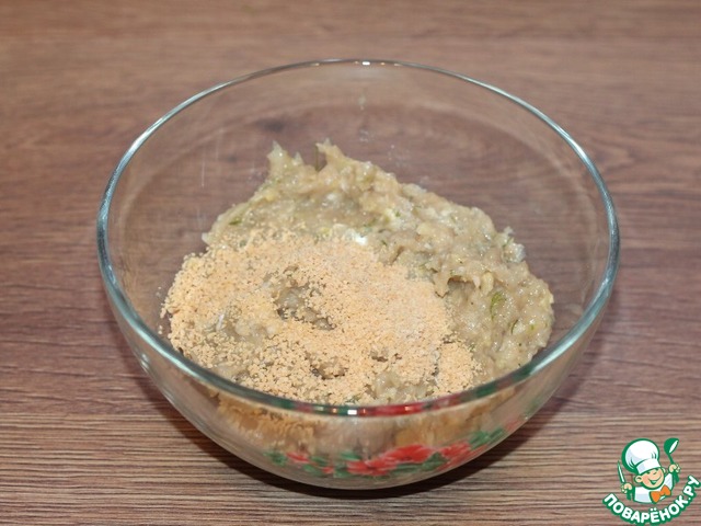 3. Добавляем в куриный фарш 1 маленький белок и 1-2 ст. л. панировочных сухарей. Фарш должен быть плотный.