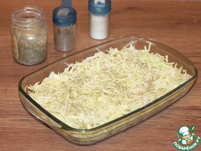 6. Смазываем формочку растительным маслом (1 ст. л.) и выкладываем капусту с тертым яблоком. Добавляем сухую приправу (1 ч. л.) и перемешиваем.