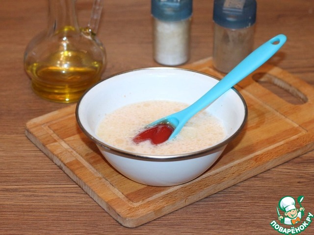8. Приготовим заливку. Смешиваем растительное масло 1 ст. л. со сметаной (2 ст. л.) и томатным кетчупом (2 ст. л.). Добавляем приправу и взбиваем вилкой. Затем добавляем бульон, солим или перчим и перемешиваем.