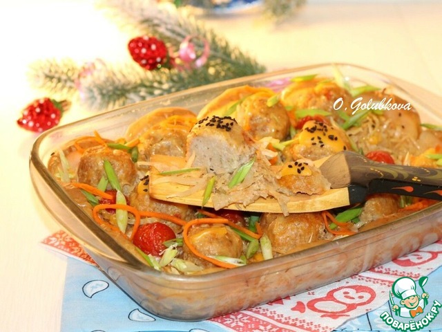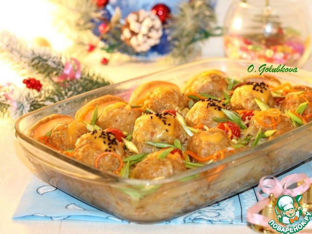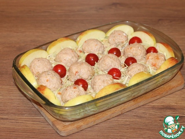 Сытное, вкусное, аппетитное и горячее блюдо, украсит ваш праздничный стол. В составе блюда: тушеная капуста, кисло-сладкие яблоки и куриные шарики. И все это тушила в пряном сметанно-томатном соусе.