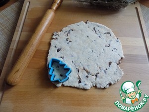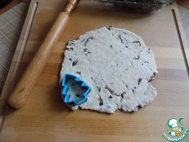 Раскатываем тесто скалкой, толщиной ~0,7 см. Я вырежу из теста ёлочки.