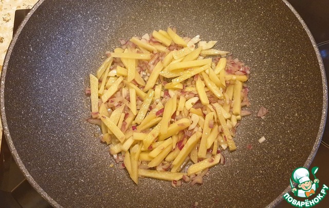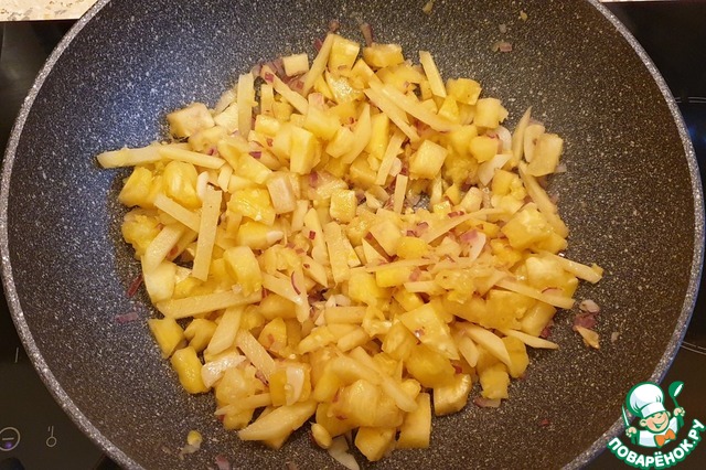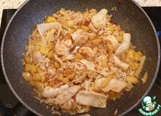 Добавить мякоть ананаса, обжарить 3 минуты.
