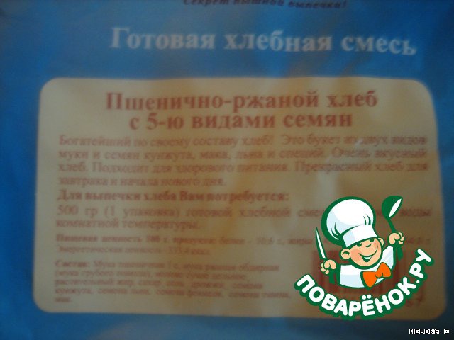 - Мука пшеничная / Мука (готовая хлебная смесь, состав:мука пшеничная,ржаная обдирная(мука грубого помола),молоко сухое цельное,растит.жир,сахар,соль,дрожжи,семена кунжута,мака,льна,фенхеля и тмин.) — 500 г