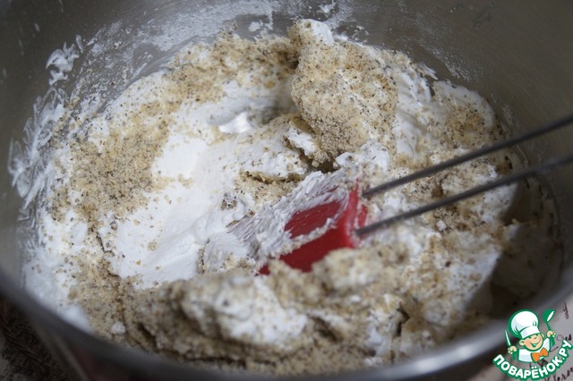 Затем белки выкладываем в чашу и аккуратно при помощи лопаточки смешиваем с орехами и крахмалом.