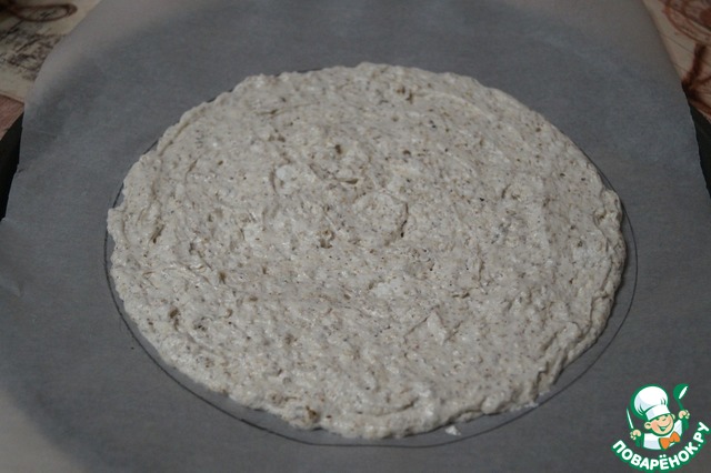 На пергаментном листе рисуем круг нужного диаметра. Белково - ореховую массу перекладываем в кондитерский мешок и формируем корж на смазанном растительным маслом пергаменте. Массу надо разделить на 2 коржа. Выпекаем корж при температуре 150 градусов в течении 20 минут. Затем корж не много остужаем и снимаем пергамент. То же делаем со вторым коржом.
