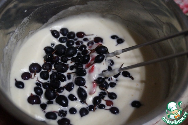 Для бисквитного коржа со смородиной, взбить яйца с сахарной пудрой в пышную светлую массу, затем просеить муку, соду и крахмал. Добавить к яичной массе и аккуратно перемешать. В тесто добавить заранее размороженные ягоды смородины. Выпекать также как и предыдущие бисквитные коржи.