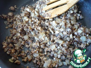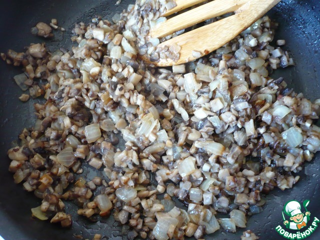 Грибы тоже мелко нарезать и добавить на сковороду с луком. Обжарить до золотистого цвета.