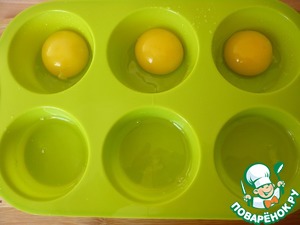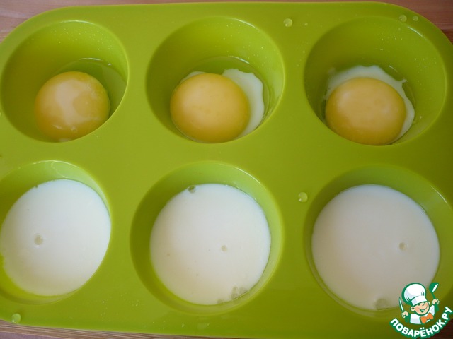 В каждую ячейку формы отдельно вылить белок и отдельно желток.