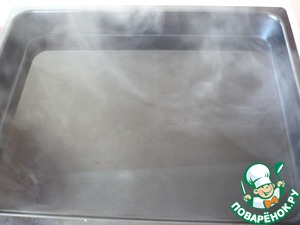 Теперь берем глубокий противень и наливаем в него кипяток.