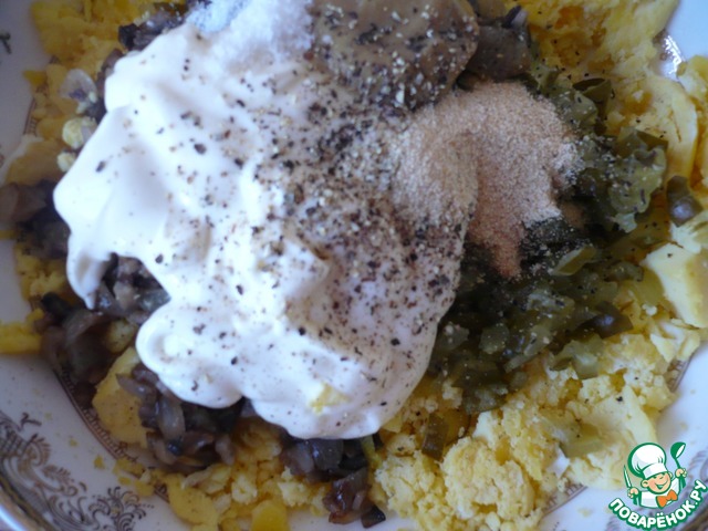 Все хорошо перемешать. Начинку обязательно попробуйте на вкус, чтобы всех ингредиентов было в меру.