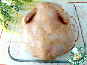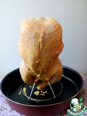 Курицу предварительно помыть, хорошо просушить бумажными полотенцами, натереть ее маринадом со всех сторон и под кожей. Укладываем курицу в подходящую посуду, накрываем пленкой или крышкой и ставим в холодильник на 2 часа.