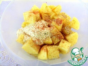 Картофель нарезать со стороной 3см, добавить к нему домашний майонез и все специи по рецепту, перемешать.