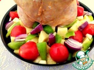 Раскладываем картофель вокруг курицы, добавляем еще овощей: помидоры разрезать пополам, перец полосочками, лук дольками, чеснок колечками. Можно взять любые овощи, которые есть у вас в доме.
