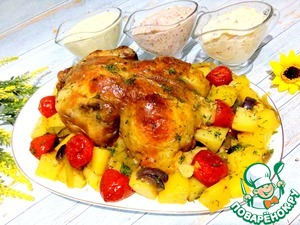 Укладываем курицу на большое блюдо, а вокруг запеченные овощи, посыпать зеленью. Это безумно вкусно. Курица получилась до того нежной, сочной и ароматной, не передать. Приятного аппетита!