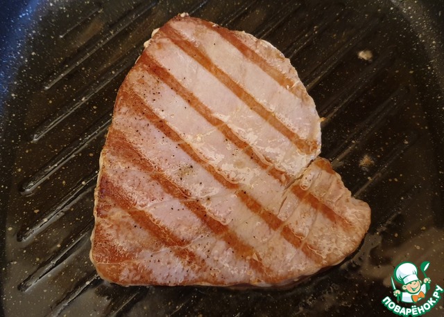 Тунца обжарить на горячей сковороде с двух сторон по 2-3 минуты. Нарезать полосками.