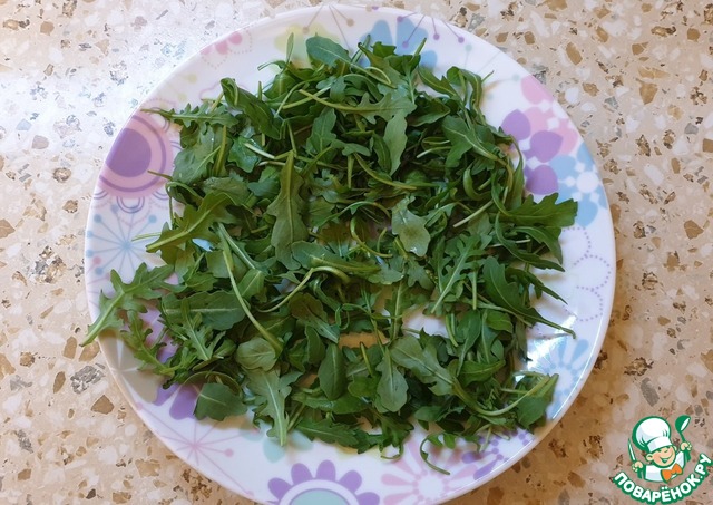 Соус: смешать оливковое масло, сок лимона и горчицу. Так же можно добавить немного соевого соуса.
