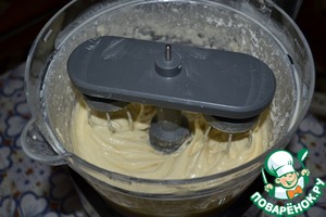 Затем добавить сливки и стакан муки, снова взбить. Открыть чашу блендера, всыпать разрыхлитель, сверху полить чайной ложкой сока лимона, взбивать ещё 15-20 секунд.