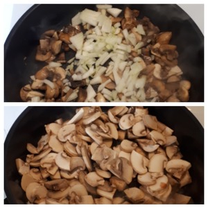 Шампиньоны нарезать и обжарить на растительном масле на раскаленной сковороде. После того как жидкость выпарится, добавить лук, дальше жарить все до готовности.