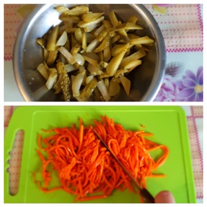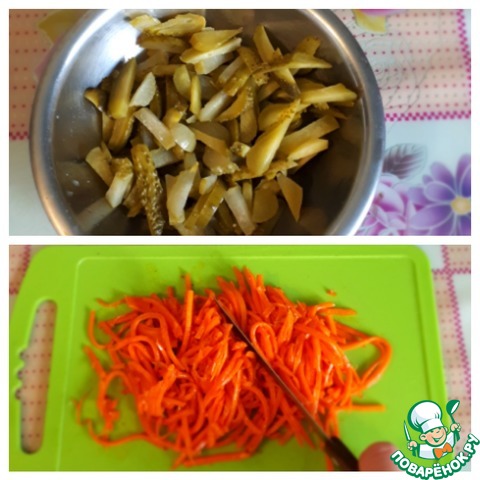 Морковь по-корейски порезать, чтобы она была не такая длинная. Огурцы нарезать соломкой.