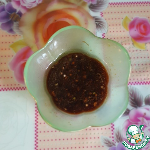 Для заправки смешать соевый соус, растительное масло, сок лимона и чеснок, добавить черный перец по вкусу.