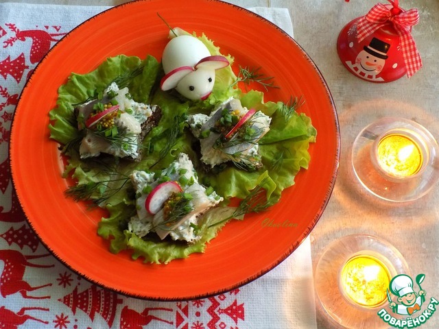 Хлеб намазываем сырным соусом щедро. Поверх выкладываем кусочки филе сельди, ещё добавляем горчицы зернистой (это для тех, кто любит поострей!) по желанию и тонкий ломтик редиса. Я буду подавать празднично, поэтому блюдо проложу салатными листьями, выложу на каждый лист по тосту, присыплю немного зелёным луком и веточками маленькими укропа. Так как у нас год белой мыши, то на тарелку выложу мышку из яйца с ушами и носиком из редиса, глазками - из перца горошком и хвостика - из стебелька укропа.