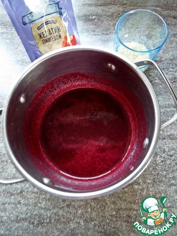 На этом этапе доведите смесь до нужного вам вкуса. Точных пропорций нет, так как вкус свеклы и клюквы может быть разным, плюс все любят по-своему. Представляйте, как будет сочетаться ваше желе с нежным паштетом. Я сделала будущее желе нейтральным по вкусу, чувствовалась и кислинка и соль и немного сахара. Поставить кастрюлю на плиту, довести до кипения. Добавить набухший желатин и дать ему полностью раствориться. Убрать кастрюлю с плиты. -