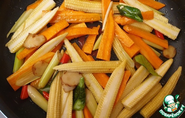 Кукурузу разрезать пополам, морковь соломкой. Обжарить морковь пару минут, добавить кукурузу. Обжарить пару минут.