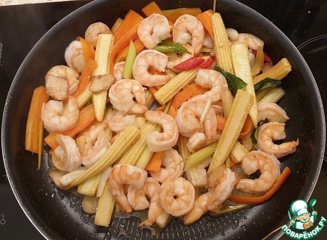 Добавить креветки и чеснок. Посолить. Обжарить креветки по паре минут с каждой стороны (креветки должны стать розовыми, но не передерживайте). Можно подавать с тайским сладким чили соусом.